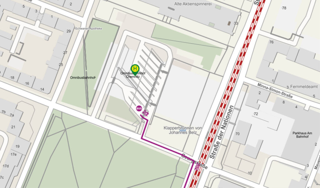 Die Abfahrts- und Ankunftshaltestelle in Chemnitz befindet sich am Omnibusbahnhof in der Nähe des Hauptbahnhofs.